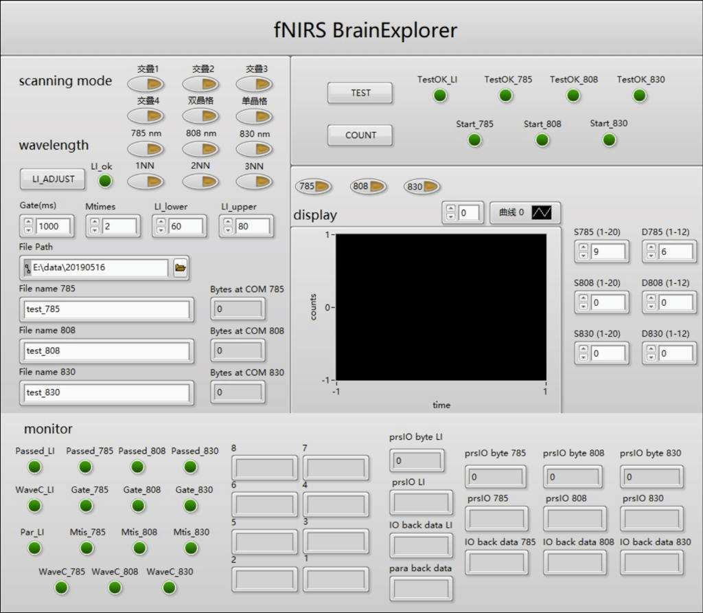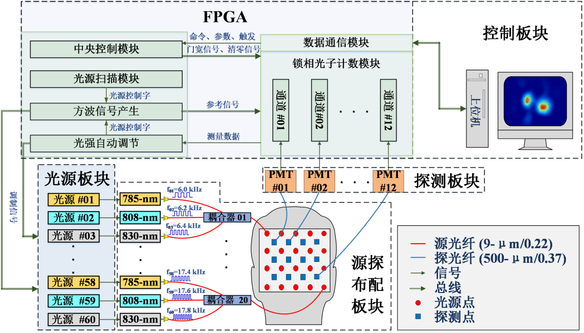 传统的模拟检测方式受限于其灵敏度及时间分辨率,难以完成大脑皮层微弱兴奋信号的检测。光子计数技术的出现及发展极大地提高检测灵敏度,但因其只能采用顺序源激励的非并行测量模式,严重降低了时间分辨率。为解决上述问题,本团队开发了一套基于锁相光子计数技术的三波长、240通道、高灵敏的HD-fNIRS系统Brain-Explorer(见图1、图2)。该系统将光子技术测量的高灵敏度、大动态范围与锁相检测的并行化优势相结合,能够有效实现HD-fNIRS系统的设计。系统采用交叠方式来完成源探布配,并提出了多种光源分场激励方案以平衡测量灵敏度和时间分辨率的多种需求。此外,本团队为使系统操作更加方便,编辑了与下位机相对应的人机交互界面,可用于参数设置、操作控制、数据显示存储以及监测指示(见图3)。