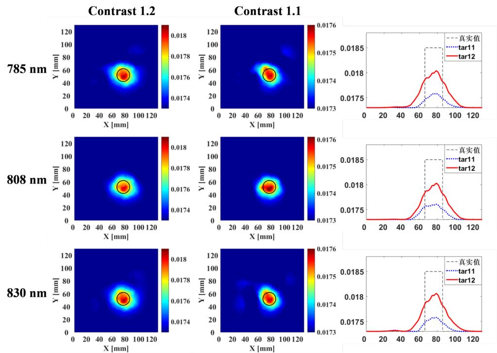 图6 不同对比度下的DOT重建结果
