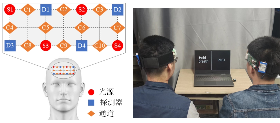 功能性近红外组织光谱学(fNIRS)能够在日常生活场景中实现神经成像,例如多人互动和多任务切换处理时的大脑激活重建,这将有助于探究真实场景下大脑内部工作模式和大脑动作特征(代谢过程、血液动力学)之间的联系,为认知研究开辟了新的方法。为此,本团队基于所发展的可穿戴近红外脑功能检测系统开展了屏气范式(图2)和协同任务范式(图4)下的超扫描研究,研究强生态效度下大脑激活分布和脑区协同规律。