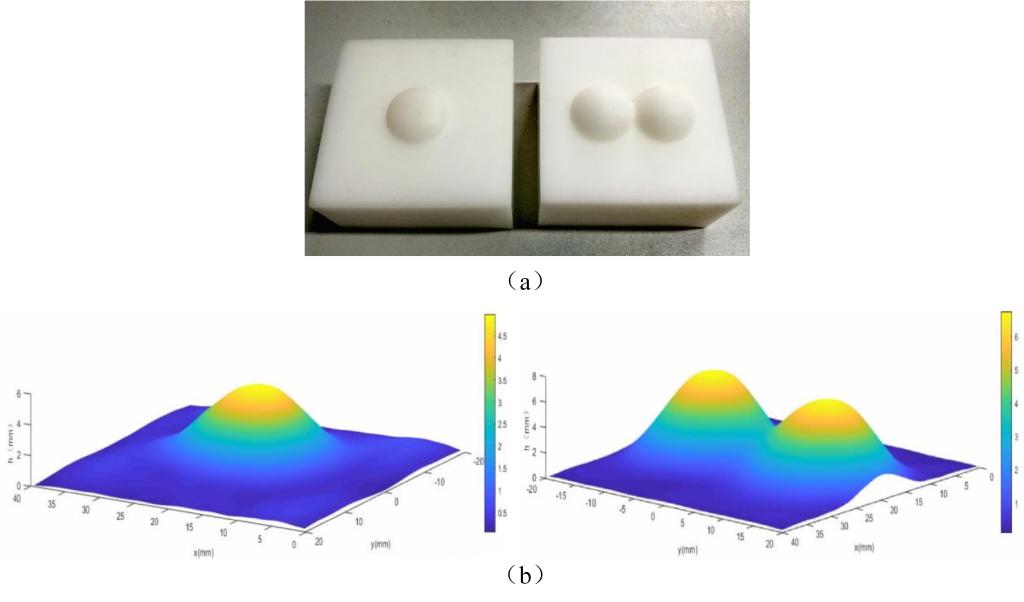 图2 (a)球仿体示意图,(b)单球(左)及双球(右)仿体形貌重建结果。