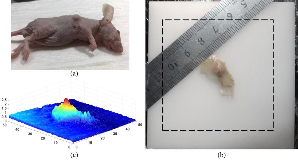 图4 小鼠皮下移植瘤模型实验样品准备:(a) 小鼠皮下移植瘤模型; (b) 实验样品; (c) 实验样品三维形貌重建结果图