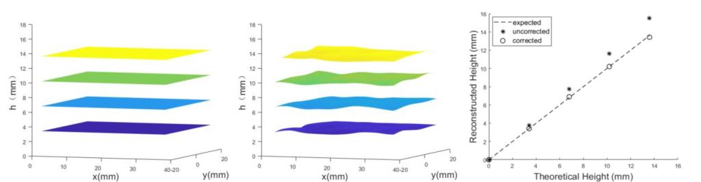 图1 不同高度平板仿体形貌重建结果:(a)仿体表面真实形貌;(b)重建形貌;(c)平均重建高度