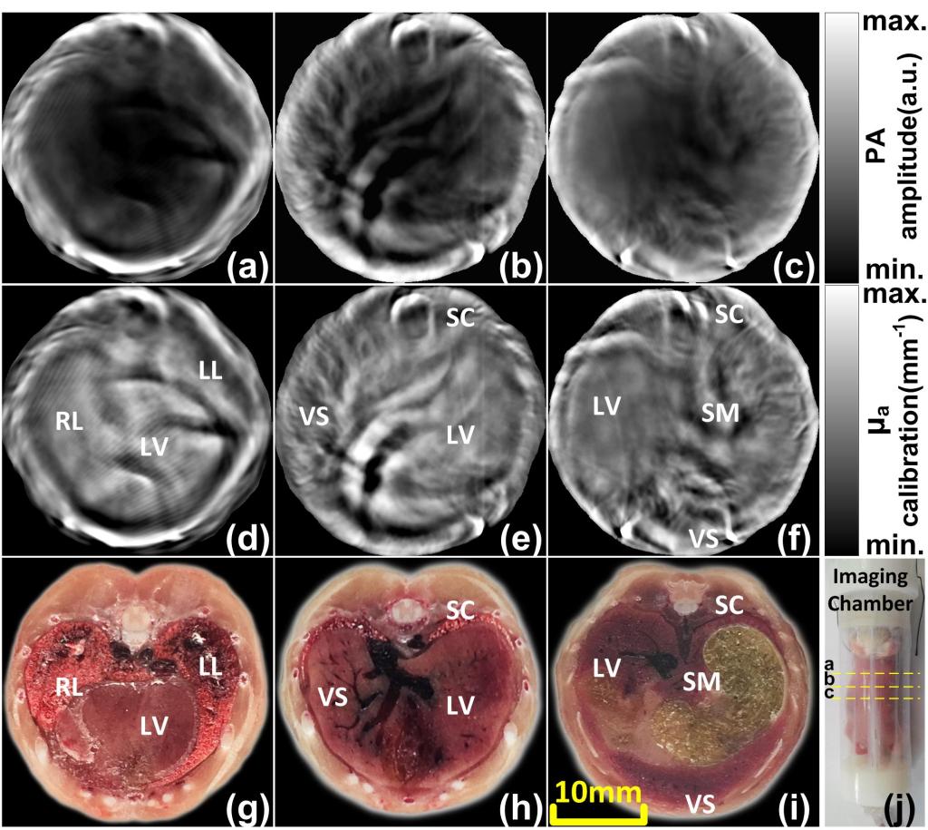 图4 活体小鼠在体实验:(a)-(c)多入射角度c-PAT重建结果((j)中黄虚线所示层);(d)-(f)多入射角度q-PAT重建结果((j)中黄虚线所示层);(g)-(i)所选成像层对应的冷冻切片结果;(j)活体小鼠与成像腔实物图