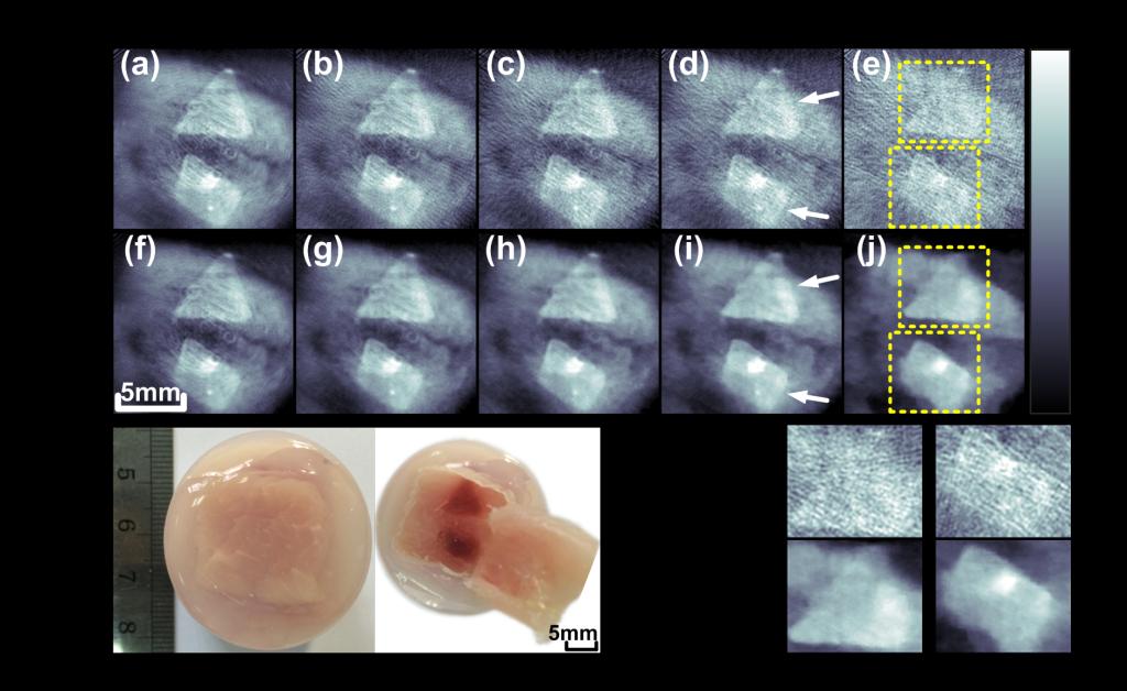 图2 模拟肿瘤的生物组织样本离体成像实验:(a)-(e)#360,#120,#90,#60和#30视角下的UBP结果;(f)-(j)#360,#120,#90,#60和#30视角下的IRT-BM3D结果;(k)-(l)生物组织样本实物图;(m)分别对应(e)和(j)中黄色虚线框内的重建细节部分