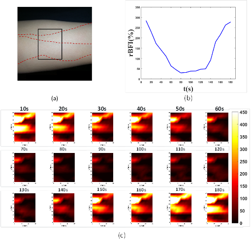 在体成像实验采用袖带加压法,结果表明,系统对血管位置及血流速度变化具有较好的分析与成像能力,三根血管能够有效的区分且其位置与实际位置基本相符,测量得到rBFI变化与实际血流变化趋势相同。