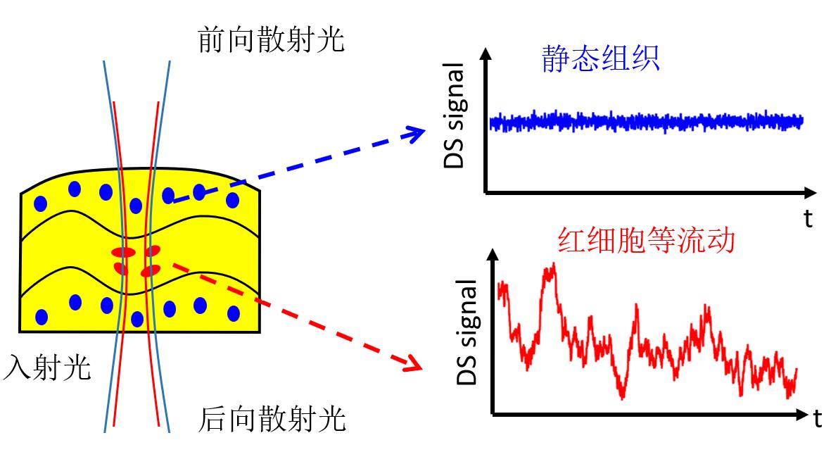 基于光学相干技术的在体血流检测方法的原理是,高度相干的激光进入组织后,由于红细胞等散射粒子的运动,导致散射光场相位发生变化,进而表现为出射光强度的起伏。在距离入射点一定距离的位置对出射光的光强进行采集后,对光强的时间序列进行处理,就可以得到在体血流成像及速度信息。