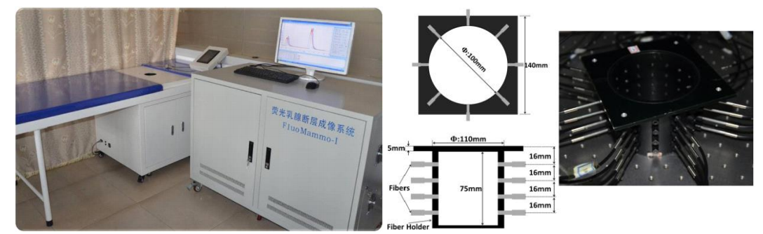 由于癌变组织的血管新生效应所呈现明显的强吸收和低氧特征,使得近红外光学成像技术在乳房肿瘤无创诊断和良、恶判断中具有十分可行的应用前景,被证明是一种具有非电离、低价和高灵敏度优点的无创检测方法,已获得广泛研究与开发。初步的临床应用在证明其有效性的同时,也指出仅依靠内在光学对比度还不足以实现早期诊断。一个重要的改善途径是发展荧光-光学层析FDOT- DOT 双模态成像,方法和系统,利用癌变组织新生血管内皮层损伤对荧光剂的“泄漏”效应提高诊断的灵敏度和特异性。