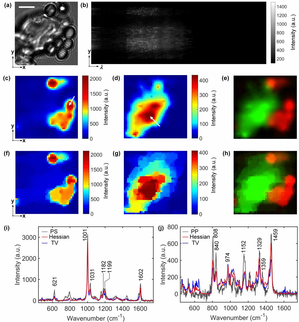 SIRI的交错投影方式避免了在光谱压缩过程中相邻空间像素点的拉曼谱峰之间的重叠,有效地对高光谱重建病态逆问题的求解空间进行了压缩。数值仿真和实验结果表明,结合总变分(Total variation, TV)或者海森(Hessian)正则化,SIRI能够以非常高的保真度从压缩的二维光谱数据中重建出原始的三维高光谱信息,能够将共聚焦拉曼高光谱成像的速度提高三个数量级。此外,与常用的TV正则化方法相比,该课题组提出的海森正则化方法将二次梯度空间的最大稀疏性作为约束条件,不仅避免了边缘过度锐化的问题,而且提高了重建图像的空间分辨率和光谱保真度。