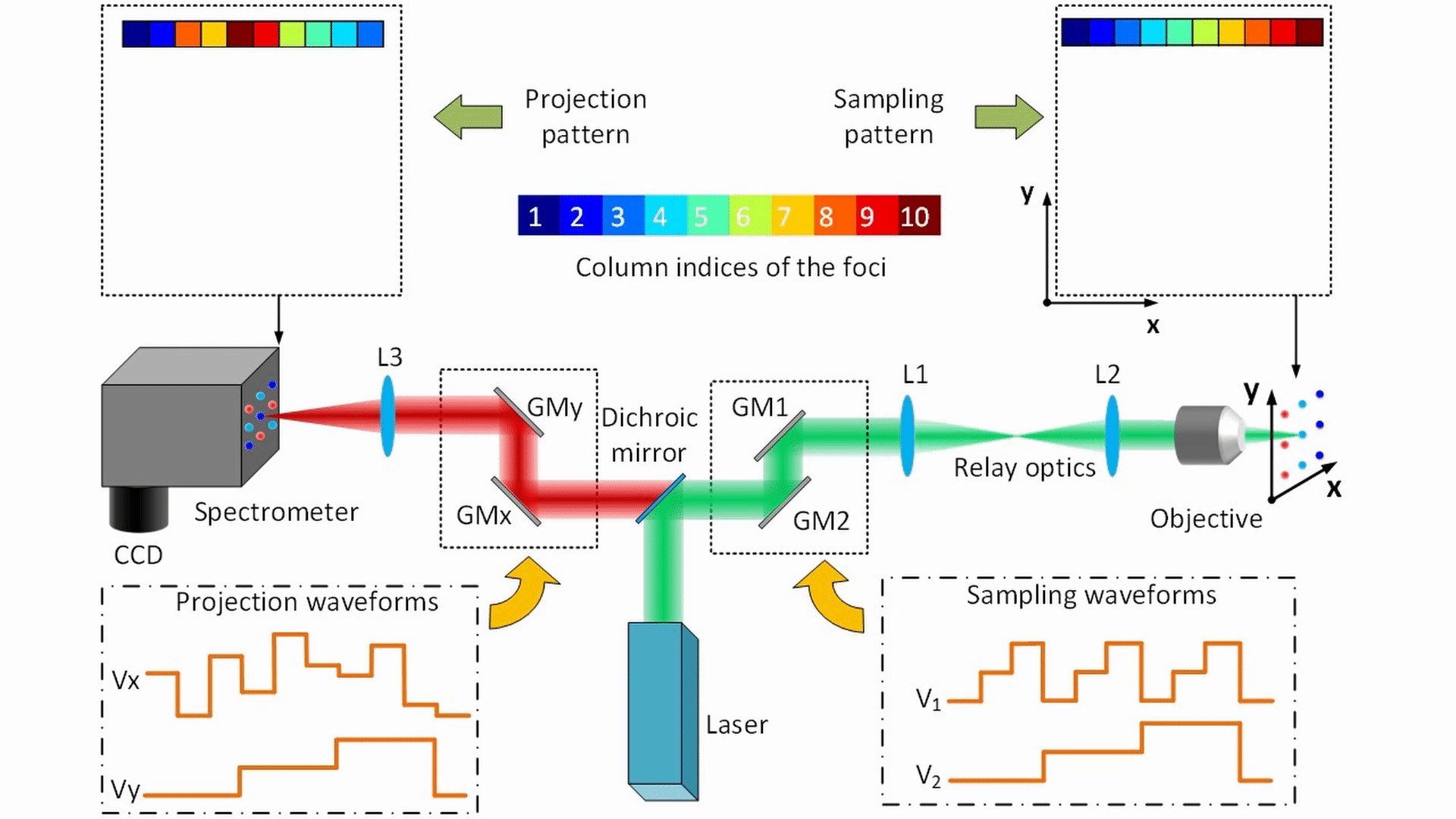 SIRI 采用高速扫描振镜产生时间上平均的二维激光阵列,并行激发样品中多达1600(40×40)个位置的拉曼散射,并利用另外一对扫描振镜同步扫描退扫描后的拉曼散射,对其投影位置进行调控。在成像光谱仪的输入平面上,激光阵列所激发的拉曼散射虽仍然以二维阵列的方式排列,但是同一行焦点所激发的拉曼散射的投影位置被随机地置换,呈现出交错排列的构型。在成像光谱仪内部,随机编码的三维高光谱信息被剪切后最终压缩在光谱采集CCD上,形成二维的压缩光谱图像。