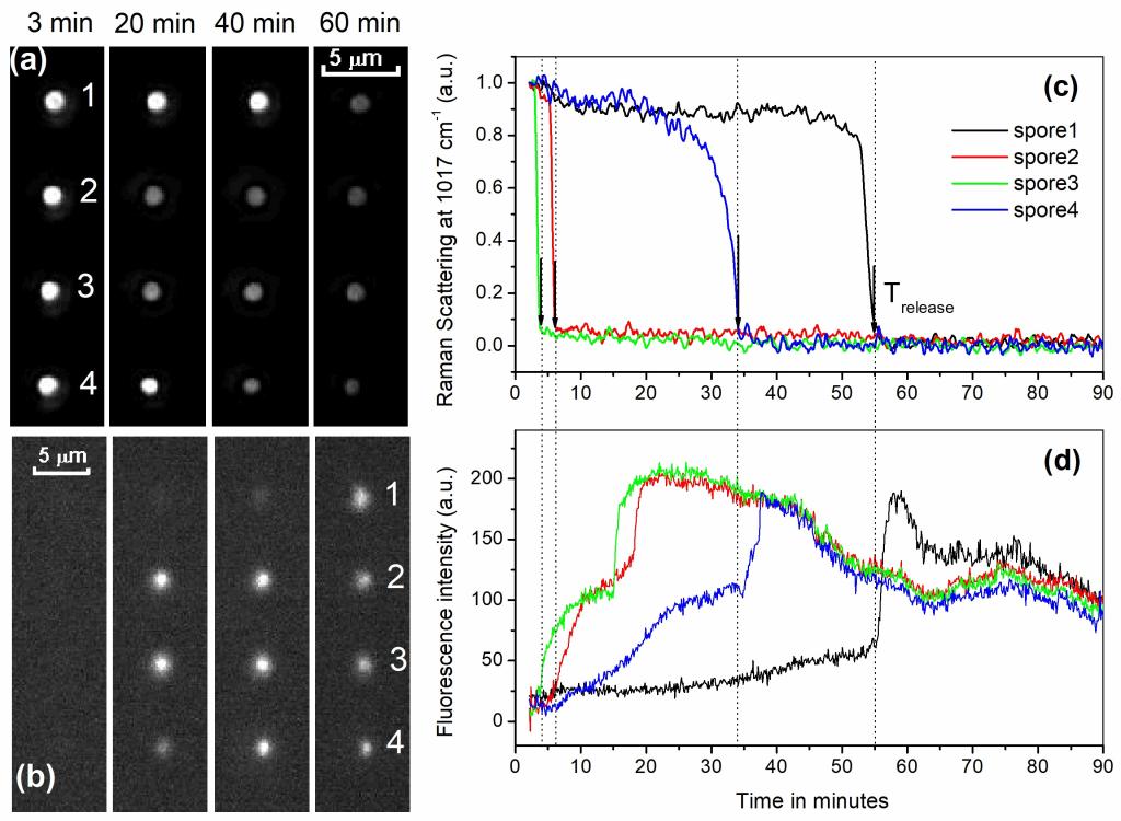 图3. 蜡样芽孢杆菌孢子在丙氨酸作用下的动态萌发过程。(a) 单芽孢的相衬显微图像;(b)单芽孢的荧光显微图像(核酸染料 syto 16);(c)4个不同芽孢萌发过程中CaDPA浓度变化曲线;(d)对应的syto 16荧光强度变化曲线。