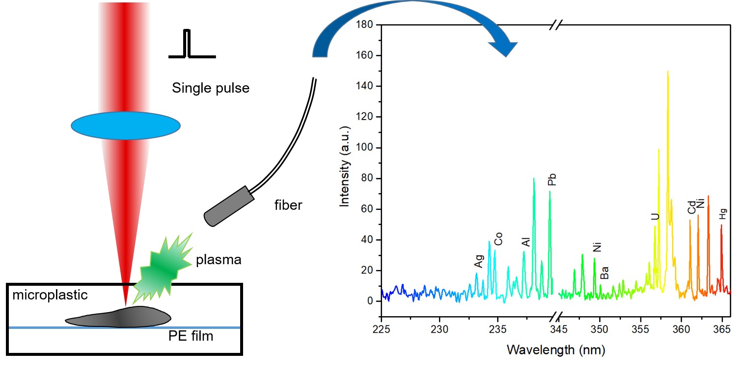 除了单细胞拉曼光谱,实验室也利用激光诱导击穿光谱(LIBS)对环境单颗粒物如大气颗粒物、海洋微塑料等进行多元素检测。单颗粒元素组成分析,不仅能够定量评估环境颗粒物对人体健康的影响,而且能够实现对颗粒物的分类、溯源以及排放控制。图4为单颗粒LIBS用于微塑料多元素检测的示意图以及单颗粒的LIBS光谱。