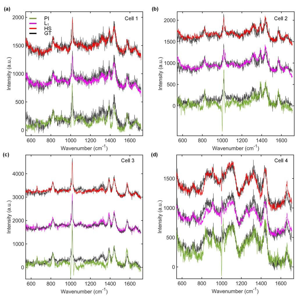 图3. 基于压缩感知光谱重建算法。(a-d)重建的四个单细胞拉曼光谱。PI: 伪逆算法;L1:一范数模型;HS: 分层稀疏模型;GT: 真实光谱。