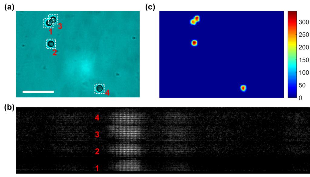 图2. 并行化共聚焦拉曼光谱技术用于高光谱拉曼成像。(a). 四个聚苯乙烯微球的显微图像;(b) 光谱CCD记录的324个焦点的拉曼散射(36×9);(c)由重建光谱获得的拉曼图像。