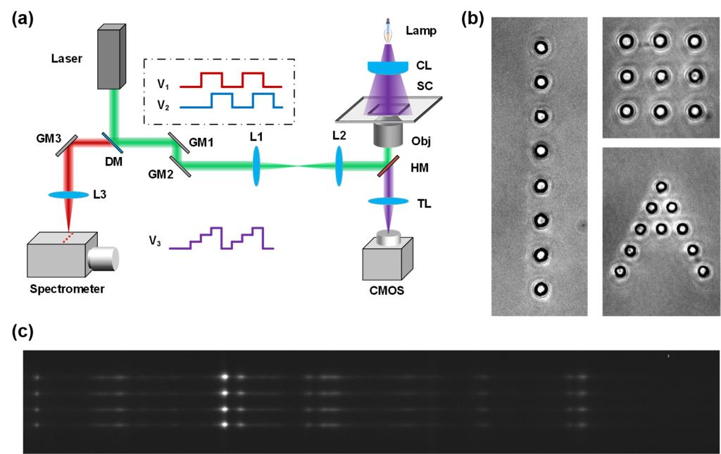 图1. 并行化共聚焦拉曼光谱。(a) 原理图;(b) 多光镊用于单细胞囚禁;(c) CCD记录的四个单细胞的拉曼散射。