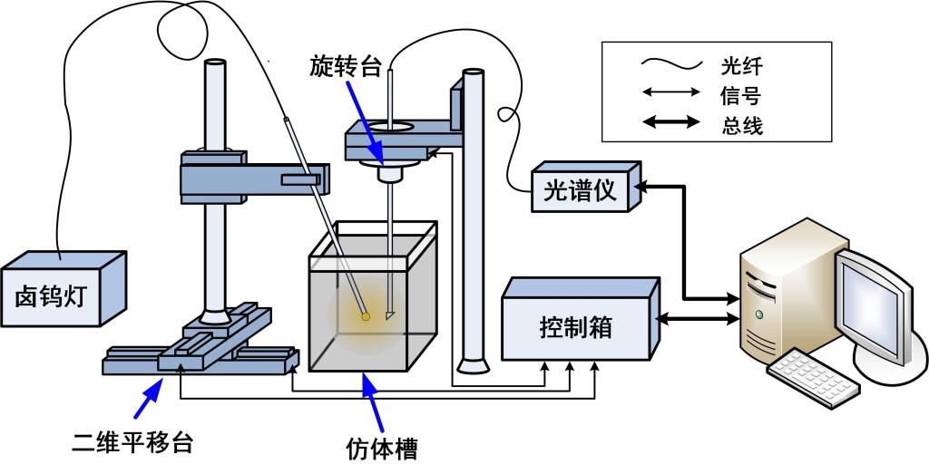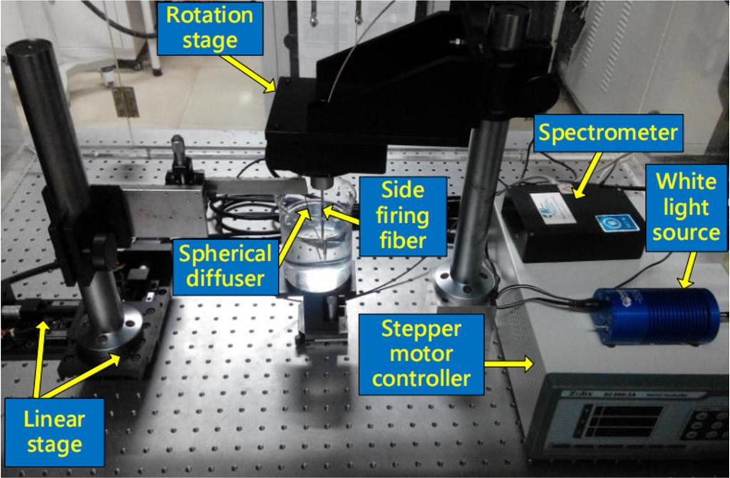 基于光谱及稳态辐射率测量系统主要由一个耦合到卤钨灯光源的球形光纤和连接到光谱仪上的侧照光纤组成,球形光纤可以实现三维上的移动,侧照光纤可以自转360°,卤钨灯光源光谱范围为200~1100nm,光谱仪的光谱范围600~1000nm。球形光源模拟点光源,在固定的源探距离下,侧照光纤可以旋转360°得到角度辐射率。