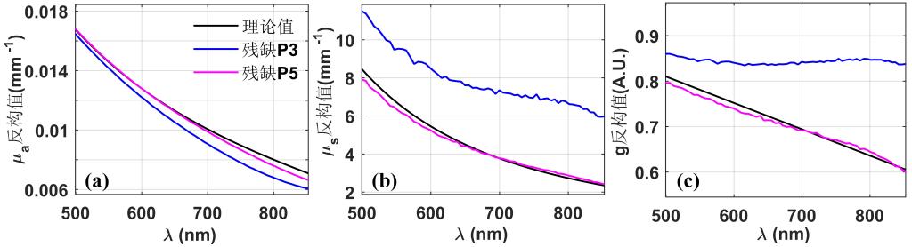 图9 在500 nm~850 nm波长范围内,利用残缺P3、残缺P5方法的全光学参数反构值。(a)为吸收系数反构值,(b)为散射系数反构值,(c)为各向异性因子g反构值