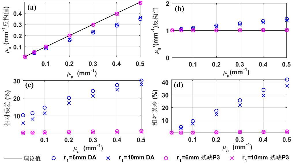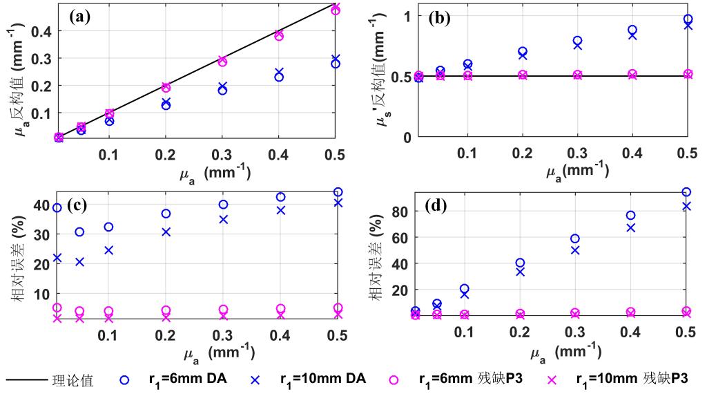 图5 典型散射情况下基于扩散近似和残缺P3近似方法的光学参数反构值及相对误差。(a)和(b)为反构值,(c)和(d)为相对误差