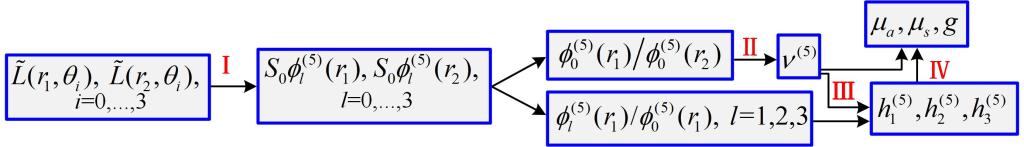 全光学参数的反构转化为从辐射率测量值中抽取v(5)、h1(5)、h2(5)和h3(5)的问题。提出了基于残缺P5近似及两个源探距离、每个源探距离六个角度下的辐射率测量值全光学参数(μa、μs和g)的解析反构方法。