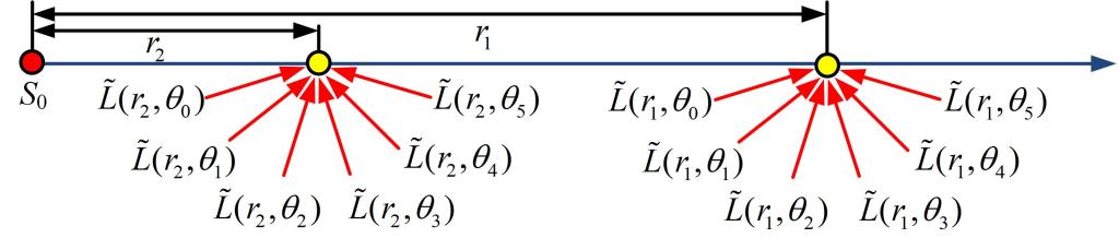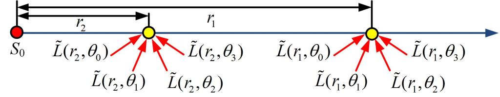 为了确定h1(3)、h2(3)和v(3),首先需要求解包含这些参数的辐射率勒让德矩与光源乘积项。由于S0Φl(3)(r)仅是简单的线性叠加,叠加系数为[(2l+1)Pl(cosθ)]/4π,因此可以通过如图8所示的固定源探距离r1、四个不同角度θ0、θ1、θ2和θ3下的辐射率测量来确定[(2l+1)Pl(cosθ)]/4π,进而通过求解线性方程组的方法来求解S0Φl(3)(r)。