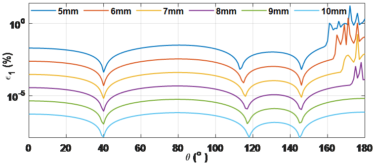 图3 在不同角度(0° - 180°)、不同源探距离(5mm - 10mm)下,残缺P3近似与传统P3近似在光学参数ua(0.01mm-1 - 0.5mm-1)、us’(0.5mm-1 - 4.5mm-1)范围内的最大差异值