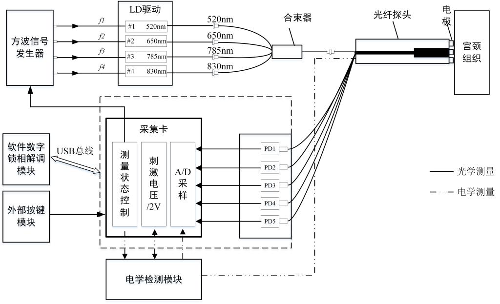 由于漫反射光信号是入射到组织体表面的空间光与组织体内部分子发生了复杂的相互作用后返回组织体表面的光,因而携带了组织体在特定光源激励下丰富的生理学信息。而通常情况下,病变组织具有血管增生和乏氧的特点,其生色团浓度会发生变化,如氧合血红蛋白和还原血红蛋白浓度,从而引起吸收系数的变化。另外组织的生理状况发生变化时,微观结构发生变化,细胞核直径增大,光密度增加,染色质也发生了改变,引起散射系数的变化。而通过内窥方式进行组织检测时,由于亚扩散域内的散射光经历了较少次数的散射事件,因而携带了更多的组织微观形态信息。通过采集亚扩散域内多个源-探距离下的漫反射光信号并计算出吸收系数和散射系数,进而实现粘膜组织病变的检测。同时基于生物组织的电阻抗特性,并借助放置于组织体表面的电极向生物物质体内注入低频的测量电压,然后检测相应的反馈电阻抗信息,也可以获取相关组织的生命状态特征或生理病理信息。光电联合检测的方式将进一步提高系统的灵敏度和特异性。