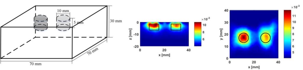 图3-1双目标仿体实验(a)仿体实物图;(b)SFD-DOT 重建出的吸收系数在z = 4 mm 处的 x-y 截面图(左)和 y = 20 mm 处的 x-z截面(右)。