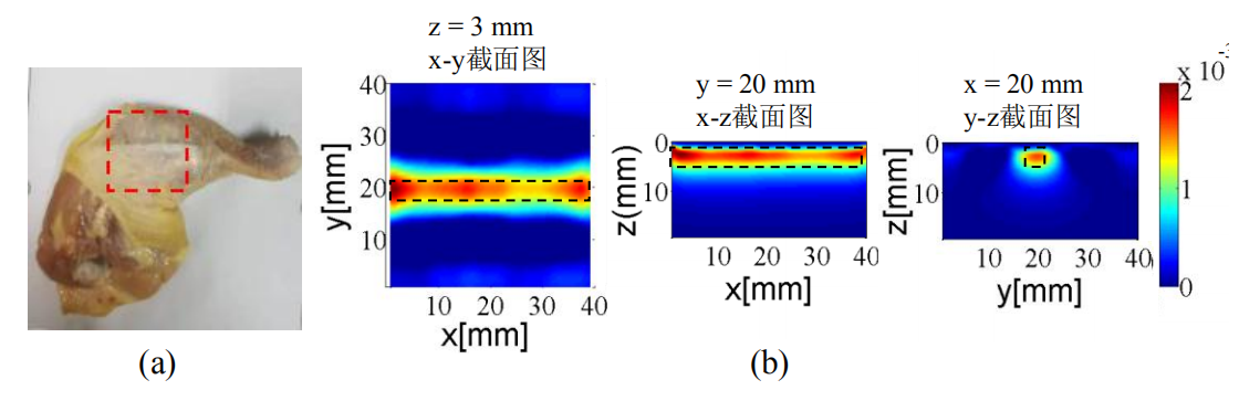图 3-2 离体鸡肉组织埋管 SFD-FMT 实验:(a) 离体鸡肉组织实物图;(b) 荧光产率层析图像。