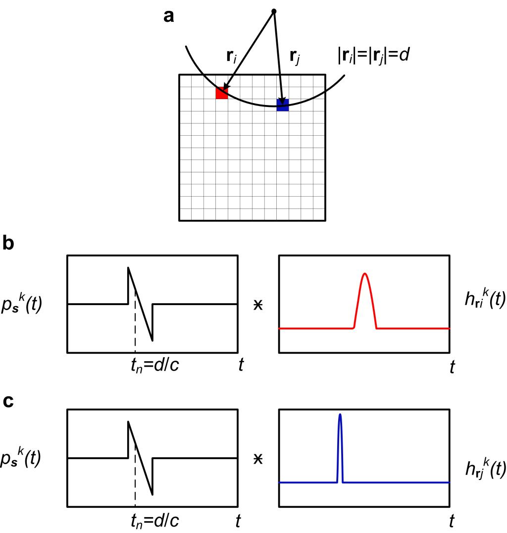 在光声介观图像重建过程中,聚焦型超声探测器的脉冲响应特性对初始声压重建结果的影响显著。通过考虑所采用的聚焦型换能器在重建过程中的空间脉冲响应(Spatial Impulse Response, SIR)和电脉冲响应(Electrical Impulse Response, EIR),可以显着提高光声介观(Optoacoustic Mesoscopy, OPAM)中重建图像的质量与保真度。然而,传统的光声重建方法通常不能充分考虑SIR特性,或由于过于庞大的计算量无法应用于大数据量的OPAM图像重建。为此,本课题组提出了一种使用空间变化滤波器对SIR进行全频校正的时域反投影方法,并将其应用于具有球形聚焦换能器的OPAM系统。首先,通过逆卷积方法去除了EIR的影响。然后,结合地震学中的非静态卷积方法,发展了任意聚焦特性超声探测器的空间变化滤波器理论,建立了基于空间变化滤波器的时域反投影重建方法,以矫正SIR对于真实光声信号的影响,进而获得精准的初始声压的空间分布情况。空间变化滤波器的原理如图1所示。图1表示了两个不同的空间位置处的SIR有明显的不同。基于空间变化滤波器的时域反投影重建方法即为在不同的空间位置上对信号进行矫正并实现图像重建。图2展示了采用不同的重建方法对实验小鼠离体肾脏数据的重建结果。结果表明,与不考虑脉冲响应的普通反投影方法(CBP)、仅考虑EIR的反投影重建方法(EIRBP)、考虑EIR但不完全考虑SIR的加权反投影方法(WBPS)相比,所提出的充分考虑EIR和SIR影响的反投影方法(SIRBP)具有更高的图像保真度、分辨率和对比度。