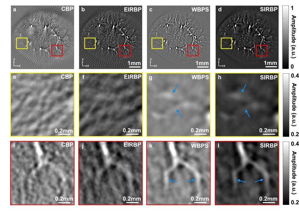 (d)SIRBP方法;(e)-(h)为四种方法中黄色正方形的放大图像;(i)-(l)为四种方法中红色正方形的放大图像。